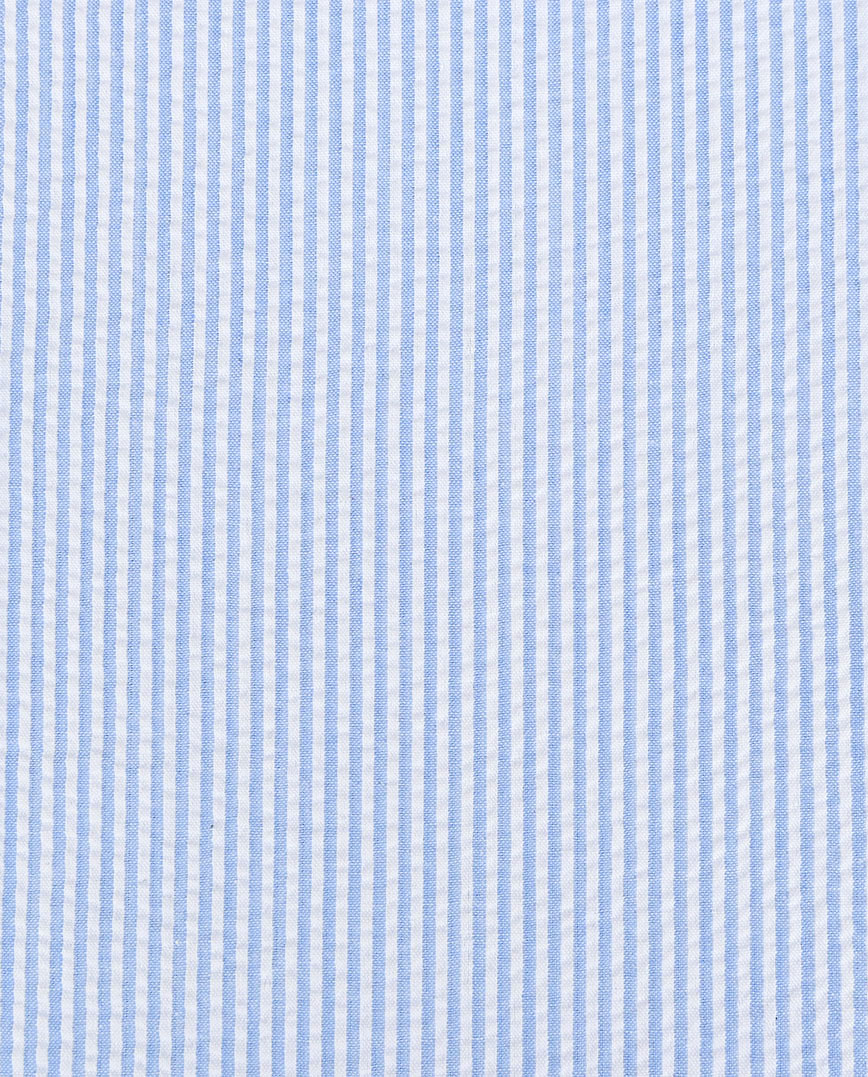 Seersucker es un tejido de algodón con efecto fruncido. Este aspecto fruncido se crea utilizando hilos largos y cortos. Hoy en día, el tejido también se fabrica con una mezcla de algodón y poliéster. Este tejido es ideal para climas más cálidos por su ligereza y porque resulta transpirable y fresco sobre la piel. Entre otras cosas, puede utilizarse para distintos tipos de prendas, como camisas, americanas, chaquetas y vestidos.